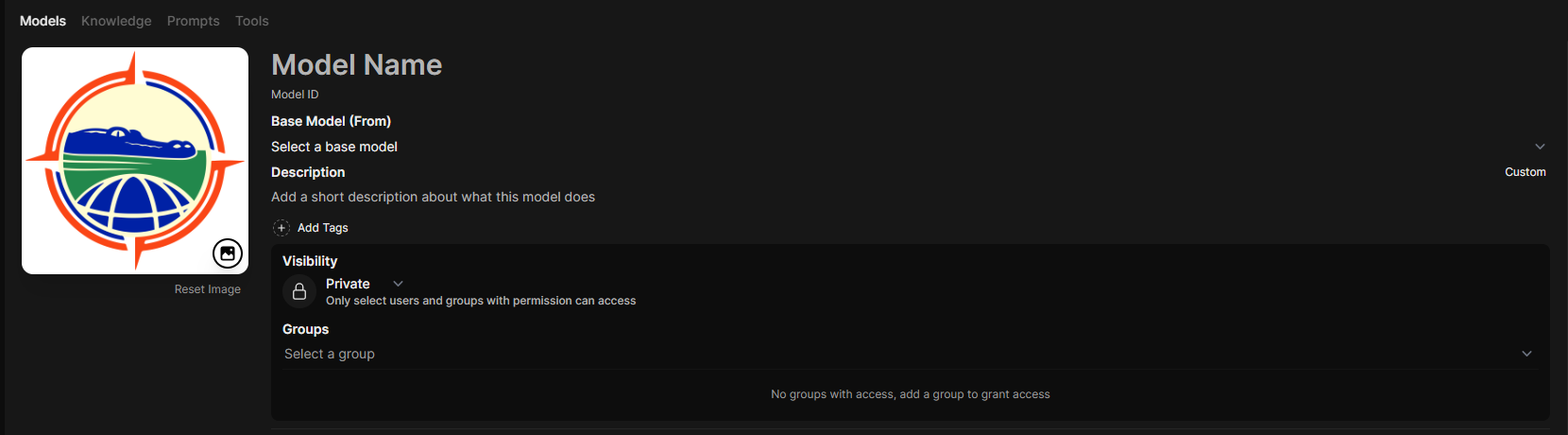 - Visability & Groups: Private models can only be seen by the user who created the model or the users within a group that the model is apart of. Public models can be seen by everyone using NaviGator Chat.